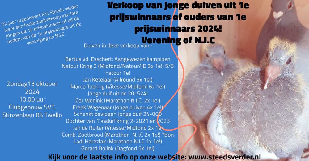 Zitten leuke tussen, maar we houden vast aan geen vasthouders op de hokken, alles wat we halen gaat los en mag laten zien of ze in ieder geval slim genoeg zijn om rond het hok te vliegen.Albert Hendriksen schreef: ↑di okt 08, 2024 22:43 Ondertussen is het beknopte verkoopprogramma uit: https://www.steedsverder.nl/images/verk ... r-2024.pdf