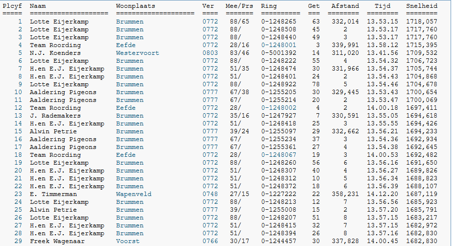 Nee hoor. Hoeveel zitten er in Brummen/Eefde als Freek zijn eerste draait? en de duiven die voorop komen bij Freek, zijn gewoon de Twellose duiven, heeft dus geen bal met kwaliteit te maken dat ze in Brummen/Eefde harder draaien. Freek heeft ze toch ook van de prairie die 100 mtr/min harder gaan?